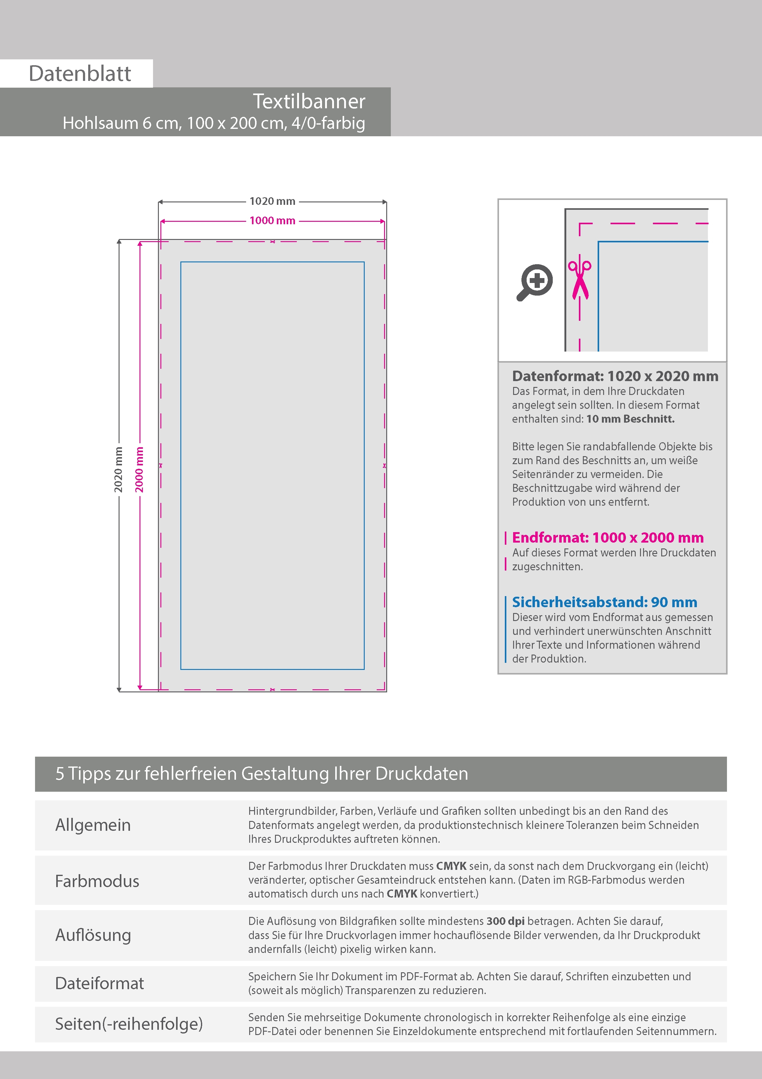 Hochwertige Stoff-Banner 100 x 200 cm, 4/0-farbig bedruckt, Hohlsaum links und rechts (Durchmesser Hohlsaum 6,0 cm)