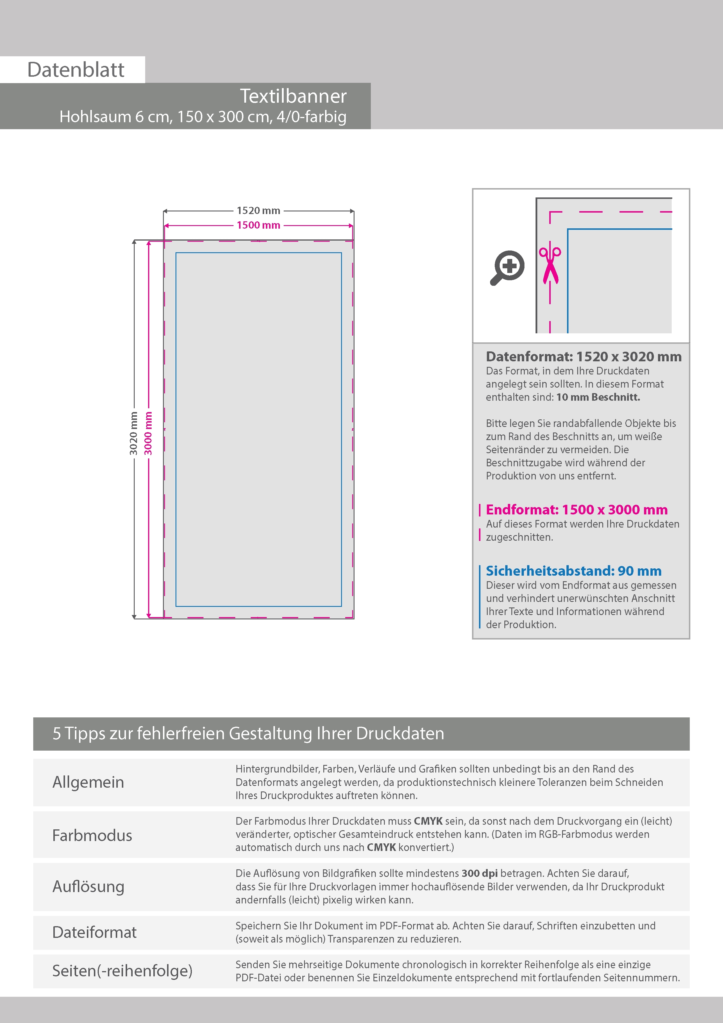 Hochwertige Stoff-Banner 150 x 300 cm, 4/0-farbig bedruckt, Hohlsaum links und rechts (Durchmesser Hohlsaum 6,0 cm)